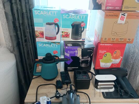 Комплект рабочей мелкой бытовой техники с уценкой — продаётся НАБОРОМ целиком! Чайники, утюги ECON/ECO, фены Scarlett/Supra, увлажнители Scarlett/SunWind, фритюрница Kitfort, пароочиститель Bort, шашлычница Oursson, измельчитель Oursson + зарядки/стабилизаторы. За полным списком пишите, вышлю Всё рабочее, проверено! Для перепродажи, сервиса или запас. части Без выбора моделей — комплектом Полный список (20+ позиций) вышлю в ЛС — пишите! Самовывоз - помогу загрузить Условия доставки оговариваем заранее. Доставка по РФ: Яндекс.Доставка СДЭК, DPD, Боксберри Почта России Ozon Оптом! Пишите и звоните
